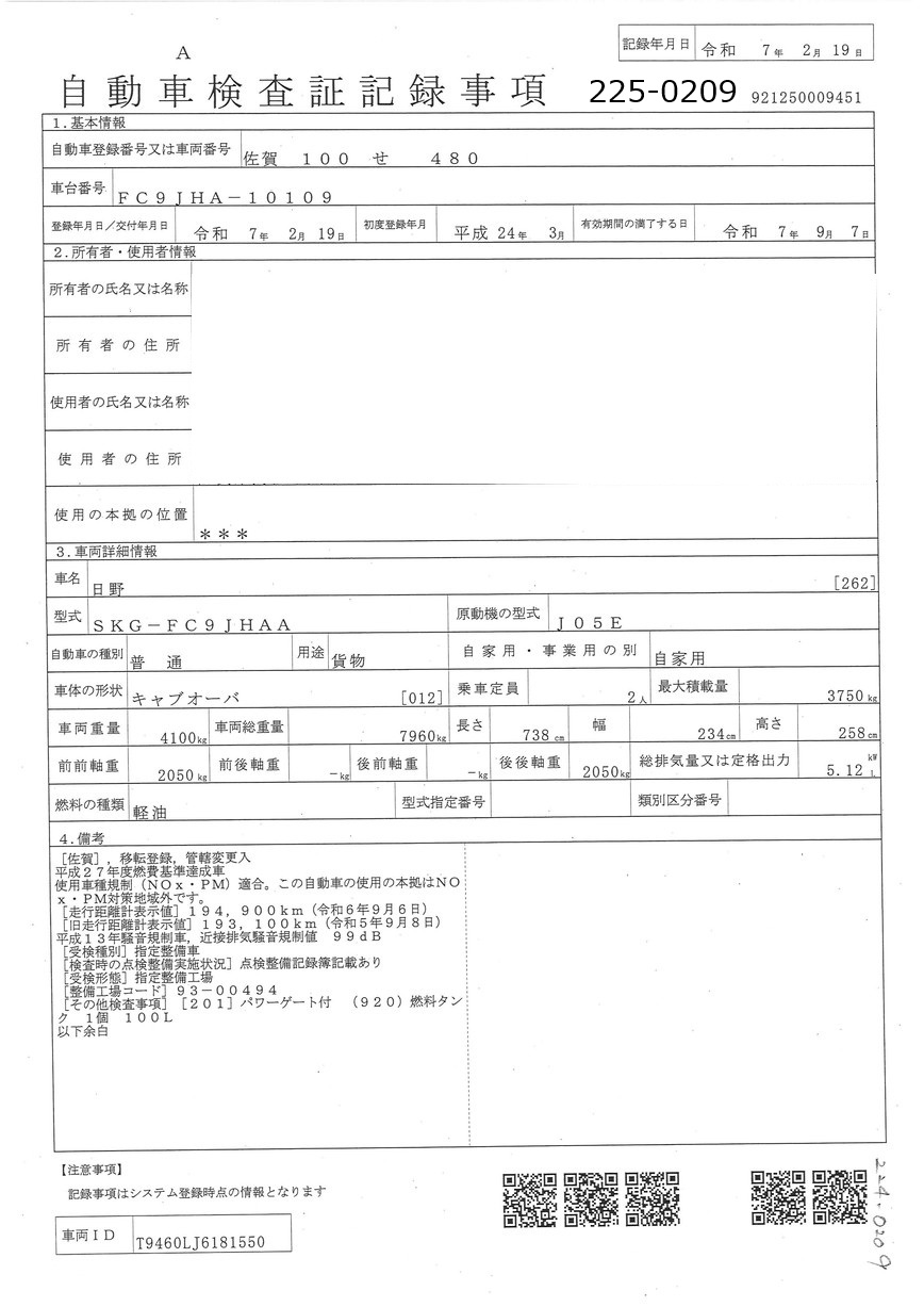 車両形式 | SKG-FC9JHAA | エンジン馬力 | 210PS |
