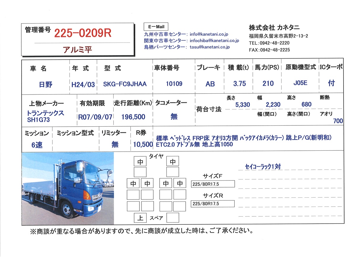 備考 | 標準 ベッドレス FRP床 アオリ3方開 バックアイカメラ(カラー) 跳上P/G(新明和) ETC2.0 アドブル無 地上高1050 |