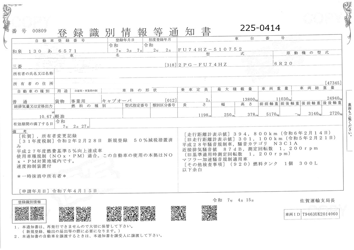 お問い合わせ番号:225-0414R| クラス(車両) | 大型 | メーカー | 三菱 |
