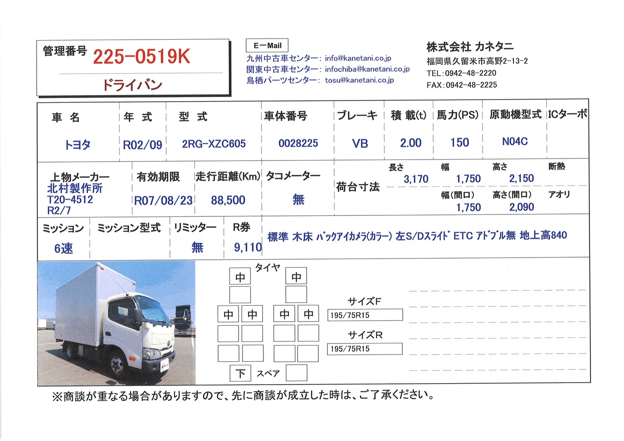 | 備考 | 標準 木床 バックアイカメラ(カラー) 左S/Dスライド ETC アドブル無 地上高840 |