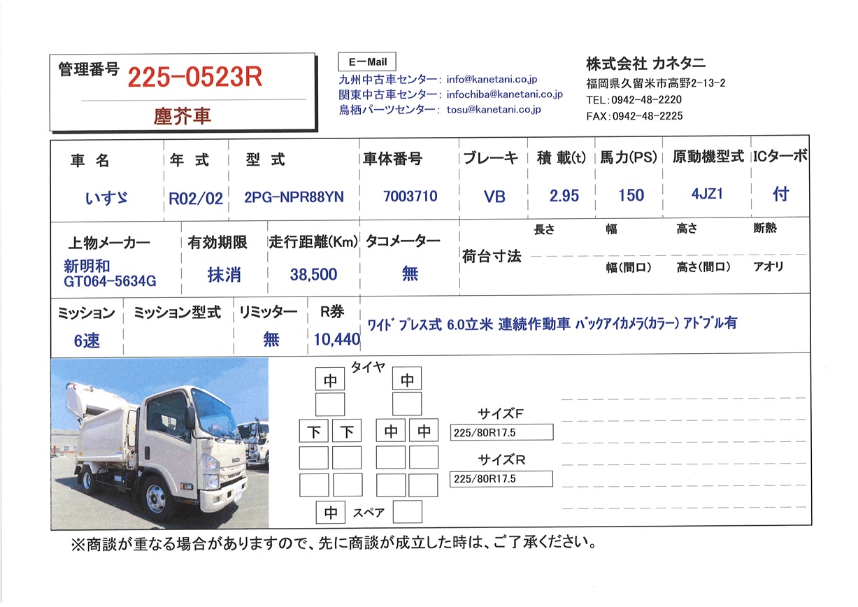 備考 | ワイド プレス式 6.0立米 連続作動車 バックアイカメラ(カラー) アドブル有 |