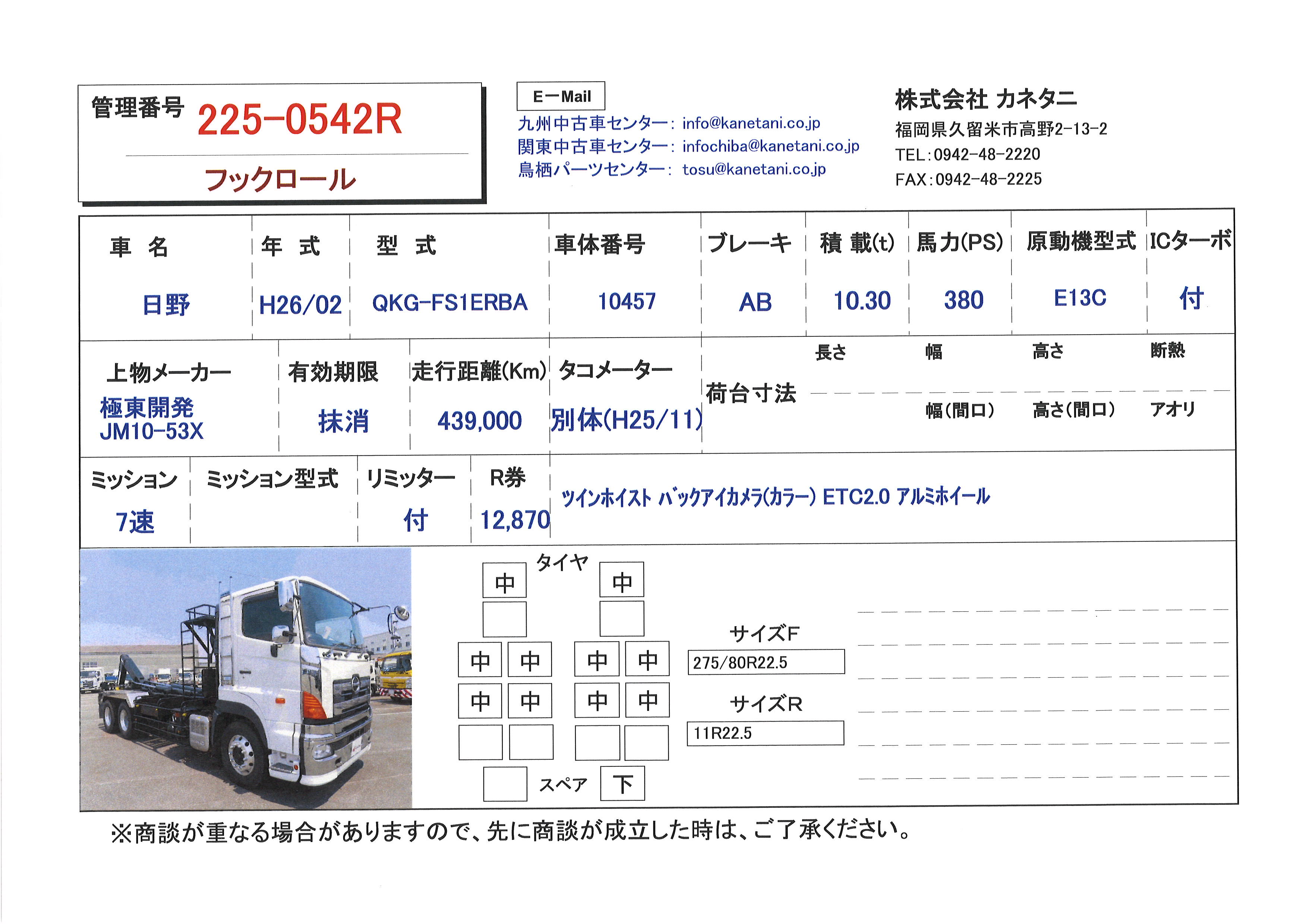 車両形式 | QKG-FS1ERBA | エンジン馬力 | 380PS |