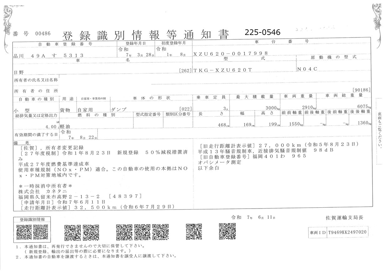 備考 | 標準 アオリ3方開 ETC 手動コボレーン アドブル無 地上高880 メインキー無 スペアキー1 |