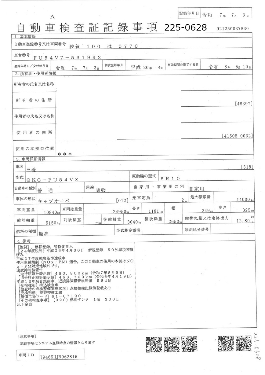 車検期限 | R08/05/10 | 走行距離 | 481,500Km |