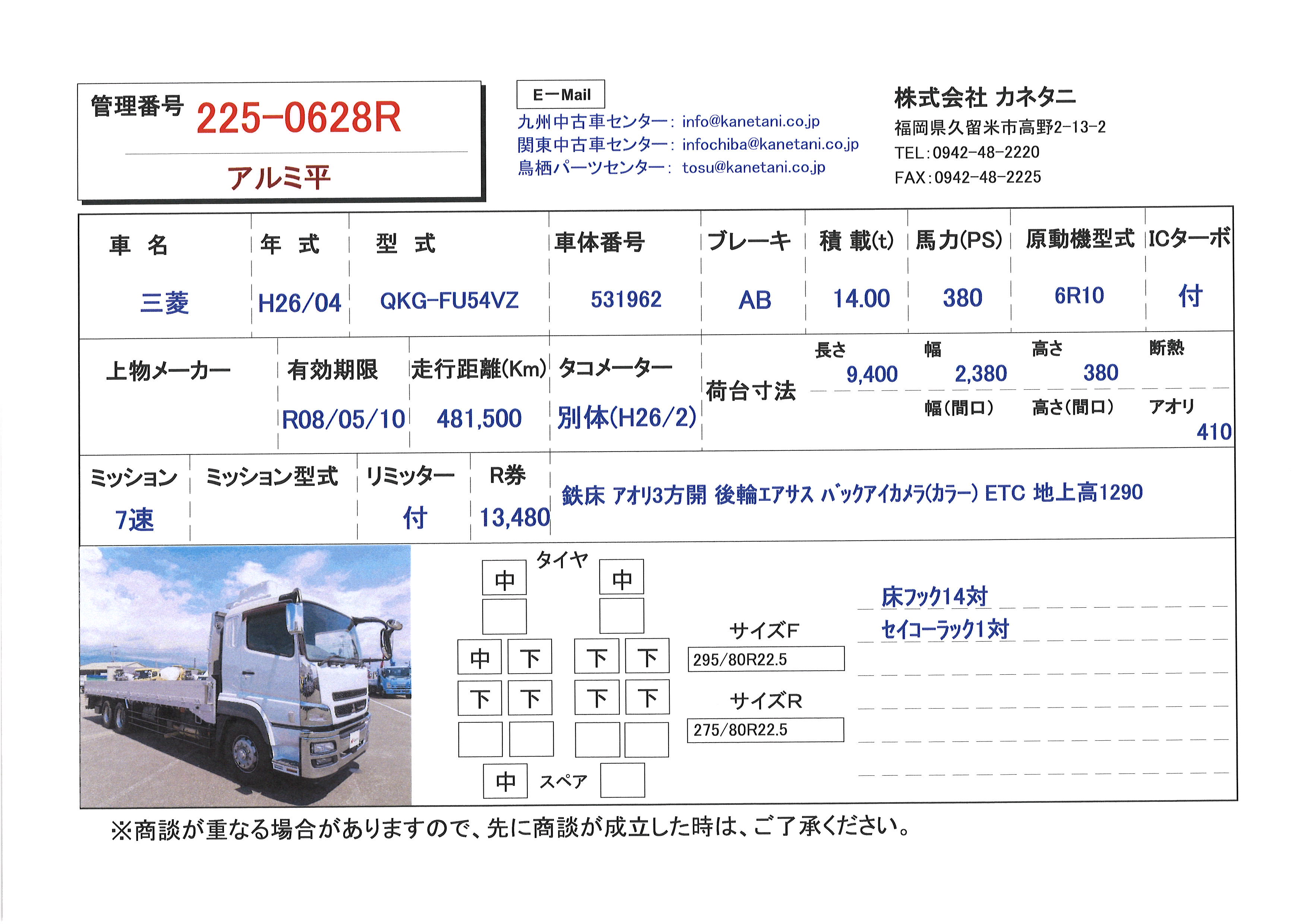 備考 | 鉄床 アオリ3方開 後輪エアサス バックアイカメラ(カラー) ETC 地上高1290 記録簿H26-R7 |
