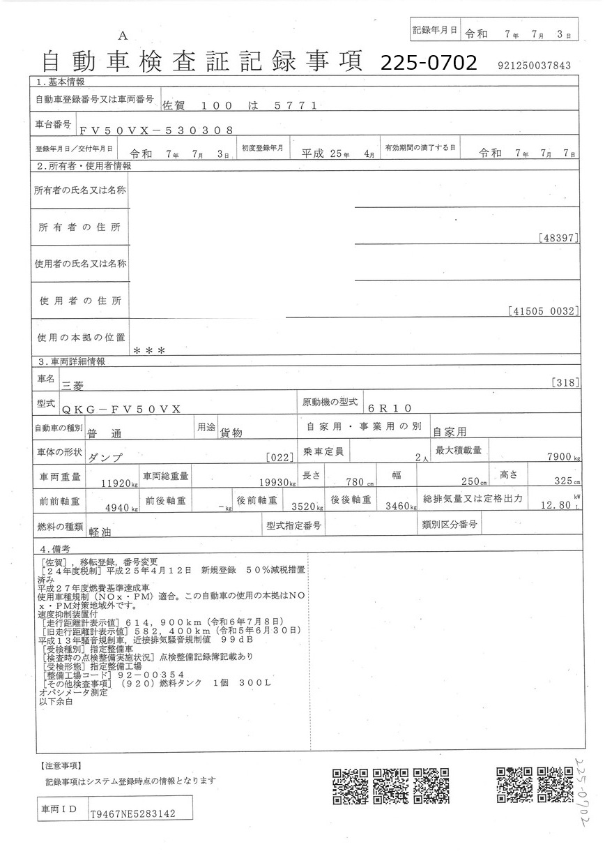 お問い合わせ番号:225-0702R| クラス(車両) | 大型 | メーカー | 三菱 |