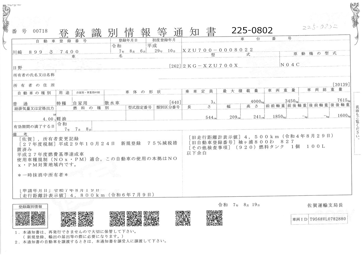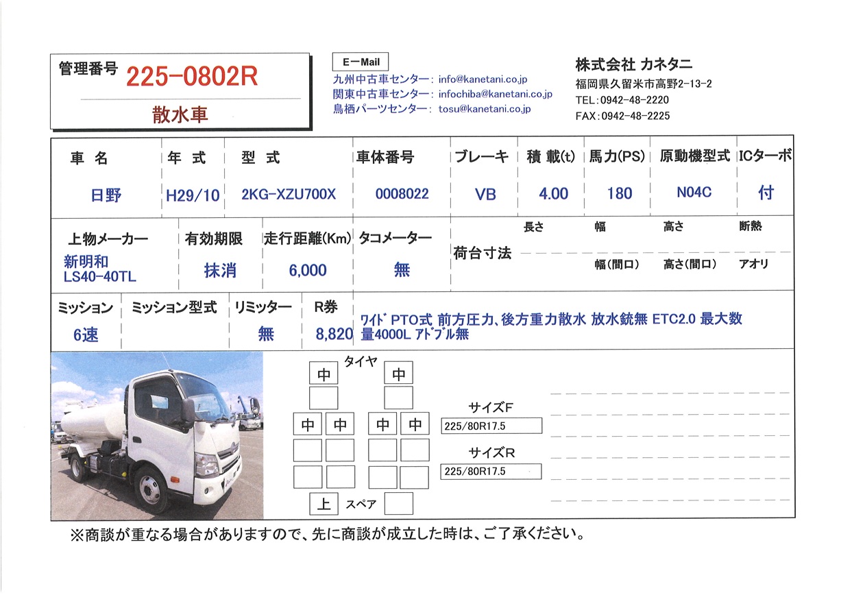 | 備考 | ワイド PTO式 前方圧力、後方重力散水 放水銃無 ETC2.0 最大数量4000L アドブル無 メインキー1 |