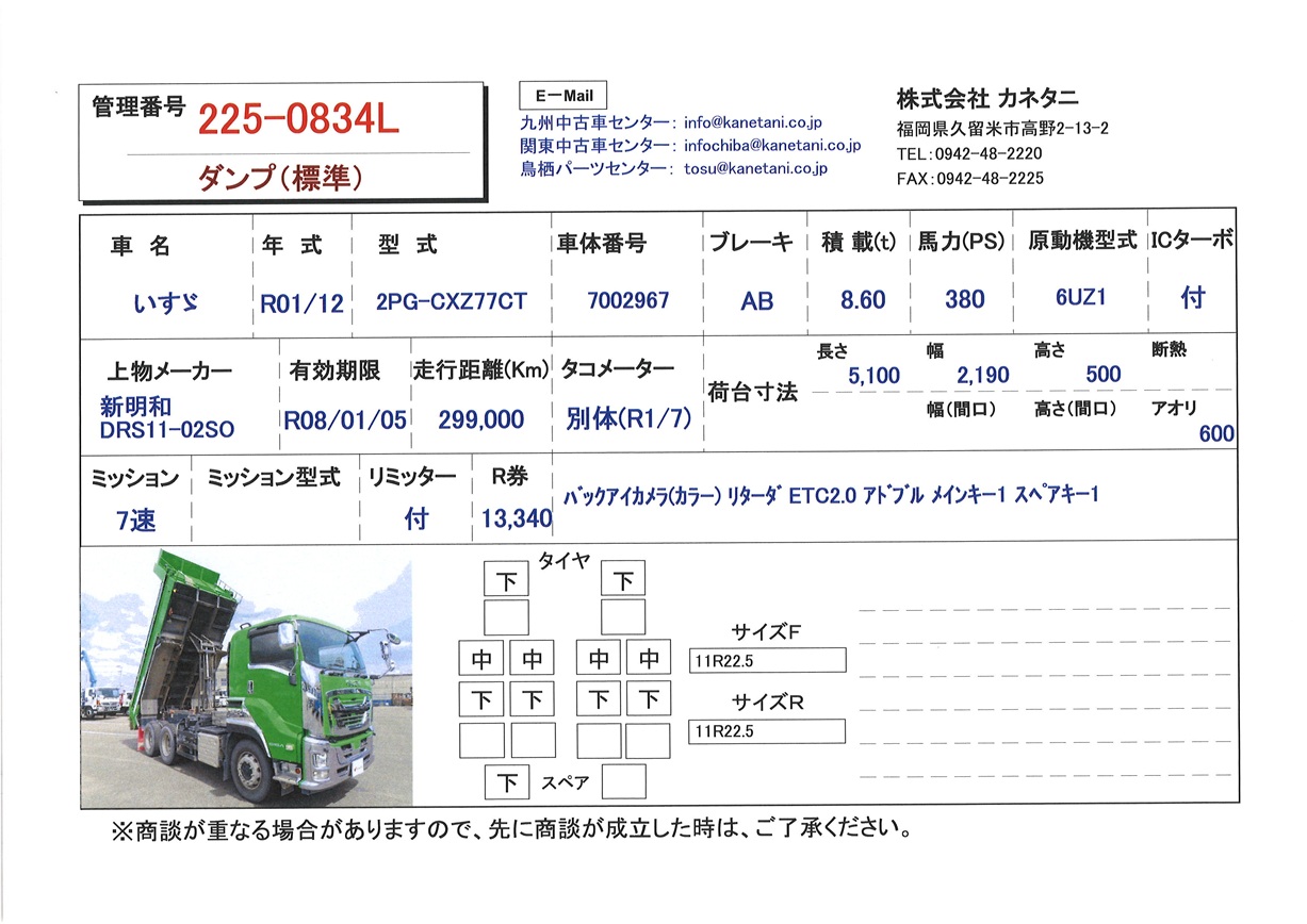 備考 | 電動コボレーン 可動式リアバンパー(手動式) バックアイカメラ(カラー) リターダ ETC2.0 アドブル メインキー1 スペアキー1 |