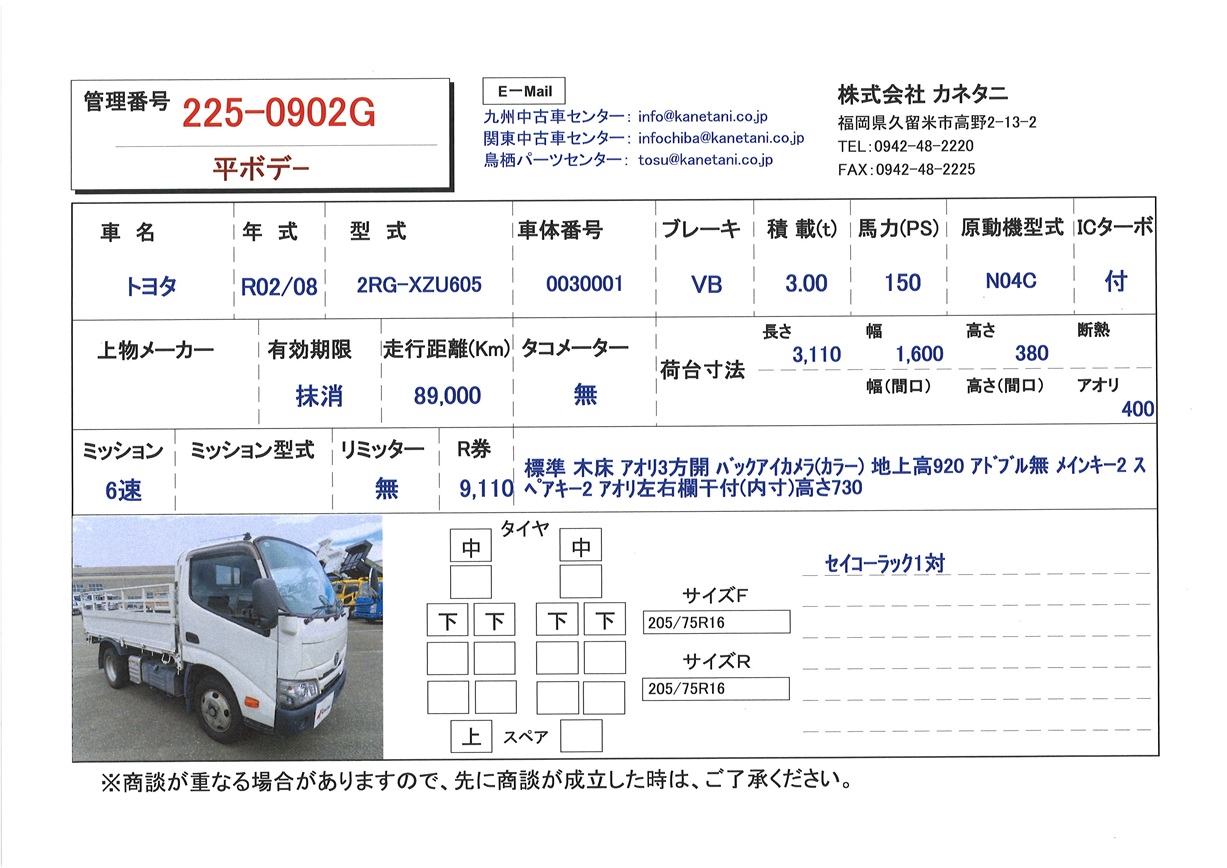 | 備考 | 標準 木床 アオリ3方開 バックアイカメラ(カラー) 地上高920 アドブル無 メインキー2 スペアキー2 アオリ左右欄干付(内寸)高さ730 |
