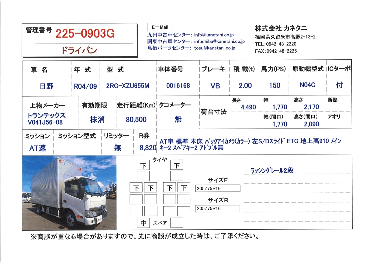 備考 | AT車 標準 木床 バックアイカメラ(カラー) 左S/Dスライド ETC 地上高910 メインキー2 スペアキー2 アドブル無 |