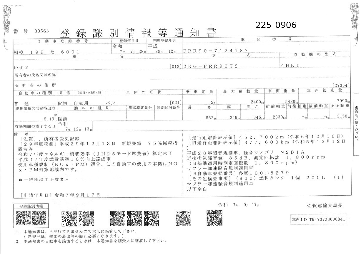 | 車検期限 | 抹消 | 走行距離 | 496,500Km |