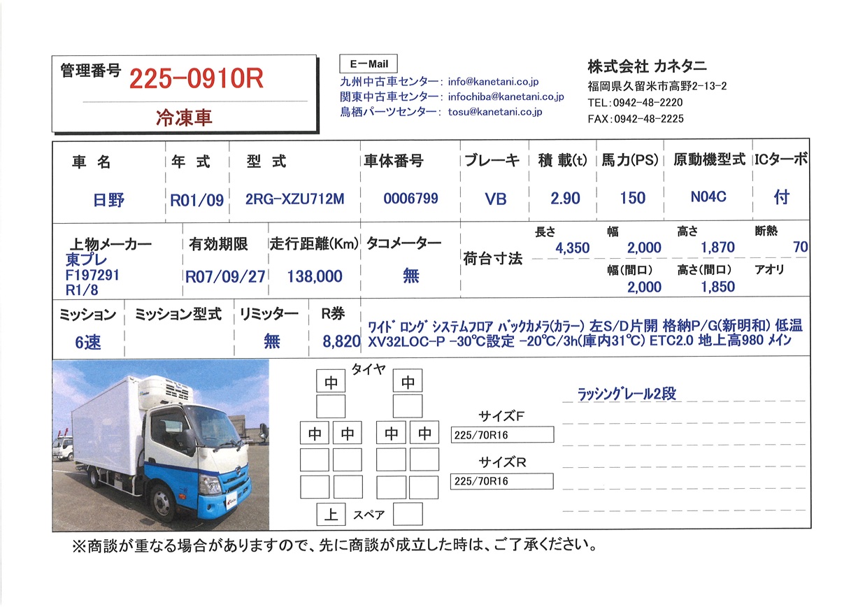 備考 | ワイド ロング システムフロア バックカメラ(カラー) 左S/D片開 格納P/G(新明和) 低温 XV32LOC-P -30℃設定 -20℃/3h(庫内31℃) ETC2.0 地上高980 メインキー2 スペアキー1 |