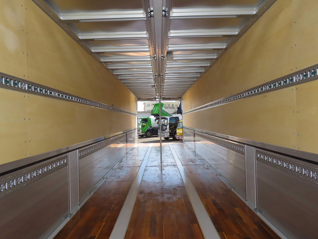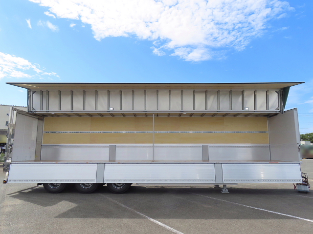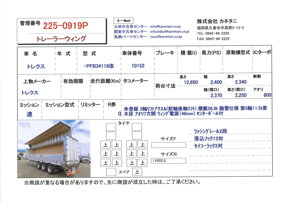 | 備考 | 未登録 3軸 リフトアクスル(前軸後軸リフト) 積載26.9t 融雪仕様 第5輪11.5t要 木床 アオリ7方開 ウィング電源(48㎜) センターポール付 |