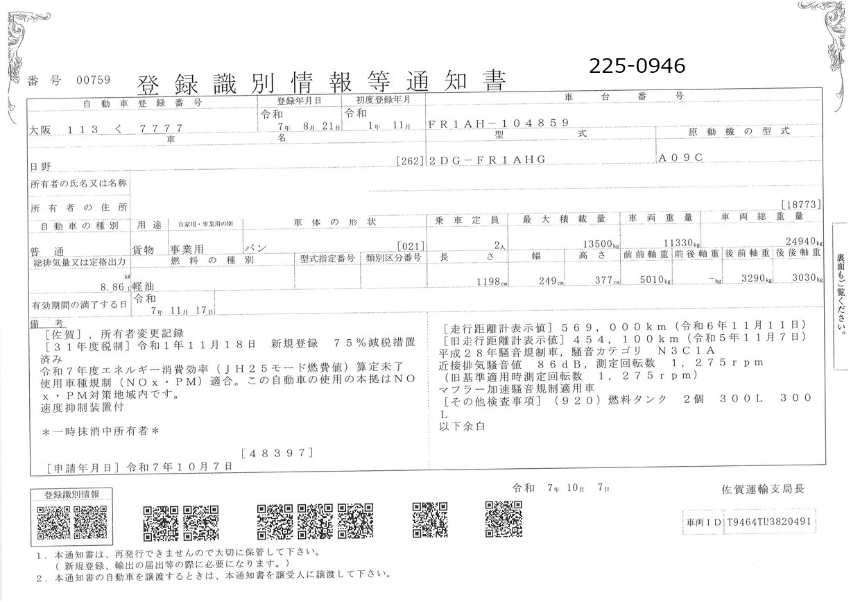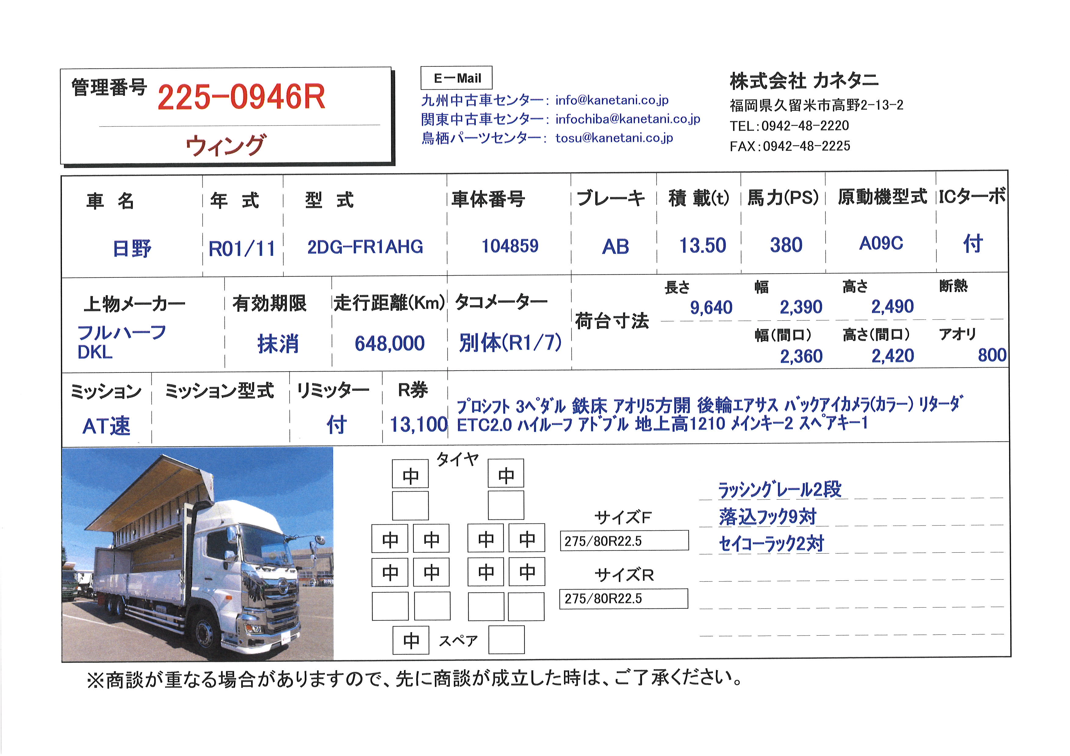 お問い合わせ番号:225-0946R| クラス(車両) | 大型 | メーカー | 日野 |