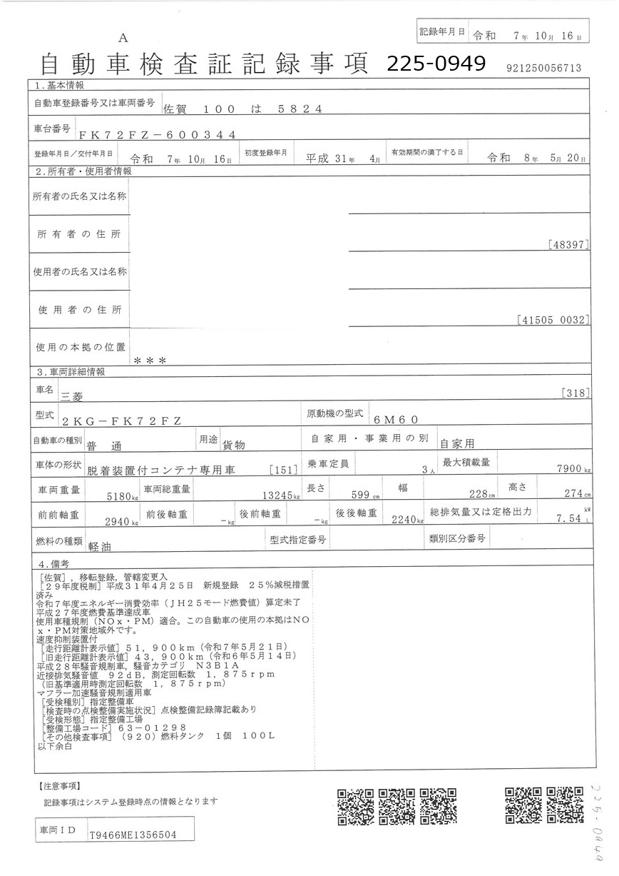 お問い合わせ番号:225-0949R| クラス(車両) | 大型 | メーカー | 三菱 |