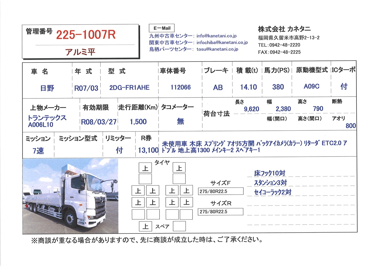 | 備考 | 未使用車 木床 スプリング アオリ5方開 バックアイカメラ(カラー) リターダ ETC2.0 アドブル 地上高1300 メインキー2 スペアキー1 |