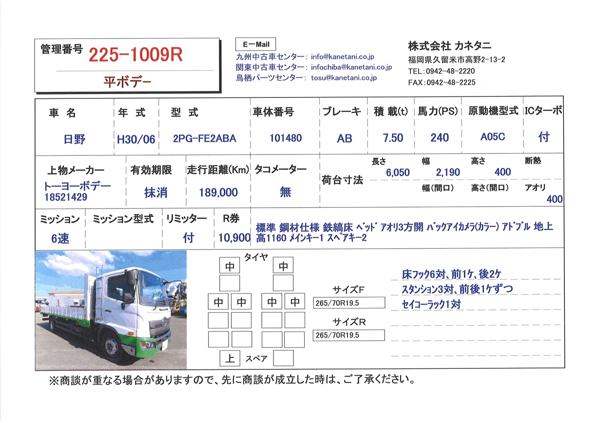 備考 | 標準 鋼材仕様 鉄縞床 ベッド アオリ3方開 バックアイカメラ(カラー) アドブル 地上高1160 メインキー1 スペアキー2 記録簿H30-R7 |