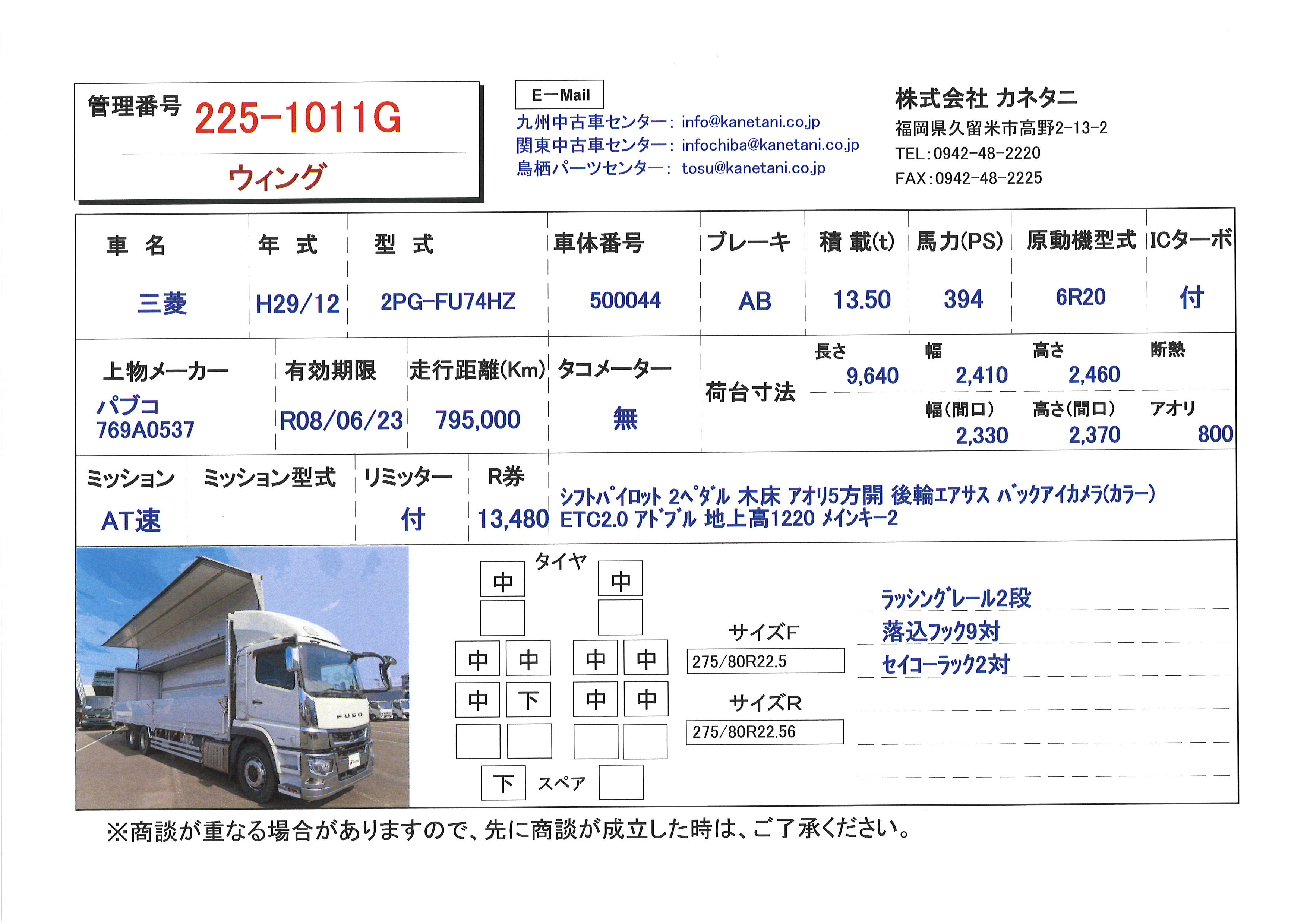 | 備考 | シフトパイロット 2ペダル 木床 アオリ5方開 後輪エアサス バックアイカメラ(カラー) ETC2.0 地上高1220 メインキー2 |