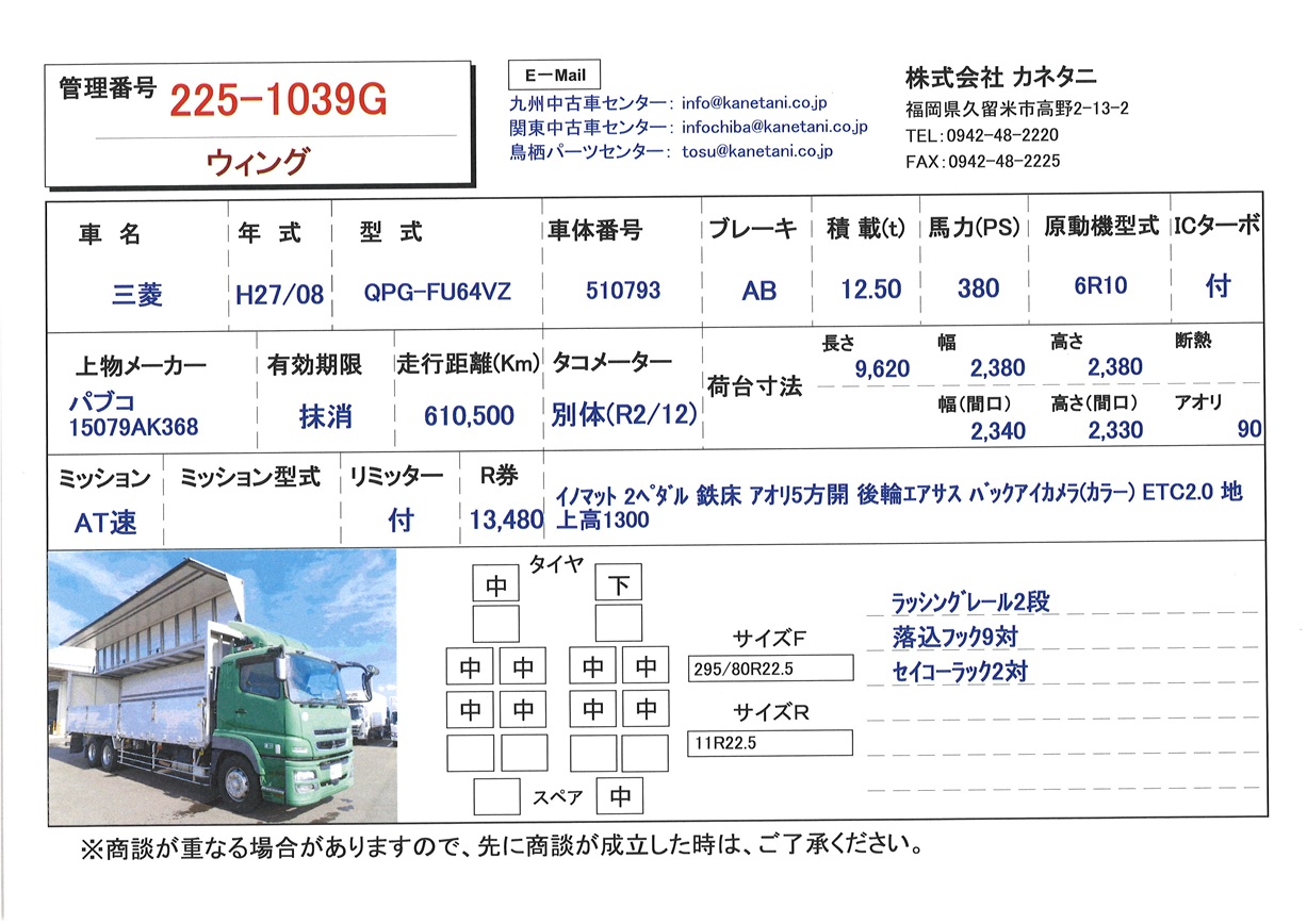 | 備考 | イノマット 2ペダル 鉄床 アオリ5方開 後輪エアサス バックアイカメラ(カラー) ETC2.0 地上高1300 |