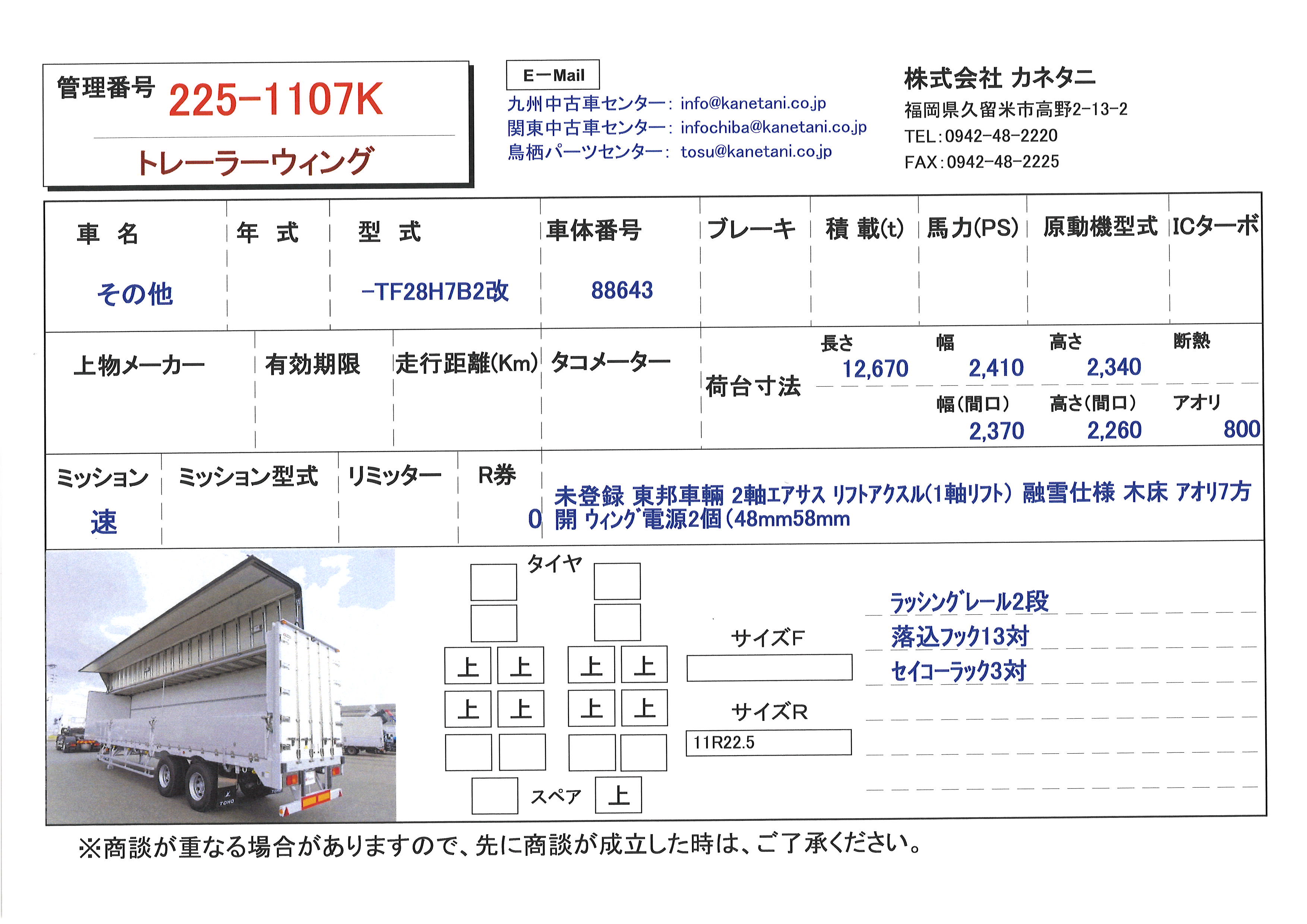 | 備考 | 東邦車輛 未登録 2軸エアサス リフトアクスル(1軸リフト) 融雪仕様 木床 アオリ7方開 ウィング電源2ケ(45㎜ 55㎜)) |