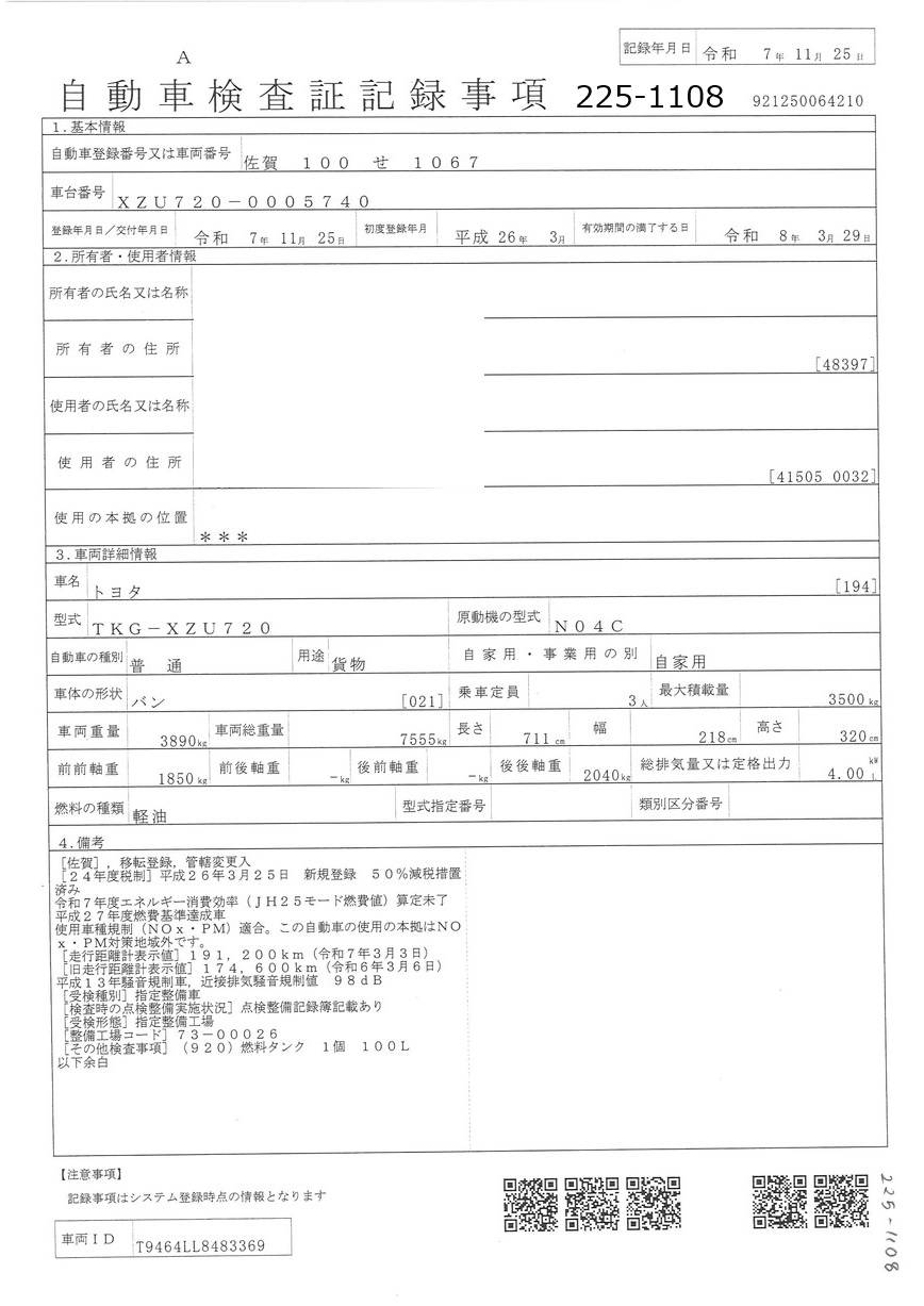 | 車検期限 | R08/03/29 | 走行距離 | 195,500Km |