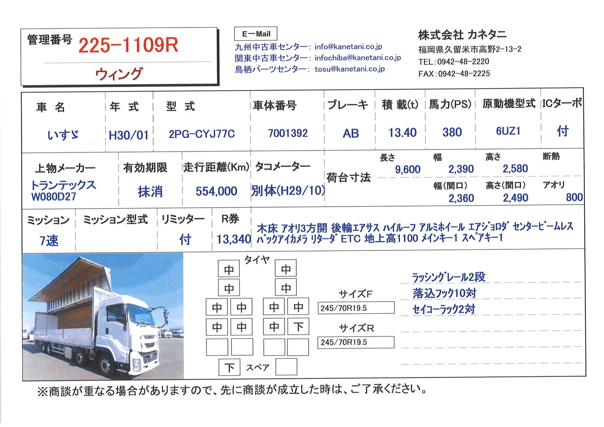 | 備考 | 木床 アオリ3方開 後輪エアサス ハイルーフ アルミホイール エアジョロダ センタービームレス バックアイカメラ リターダ ETC 地上高1100 メインキー1 スペアキー1 |