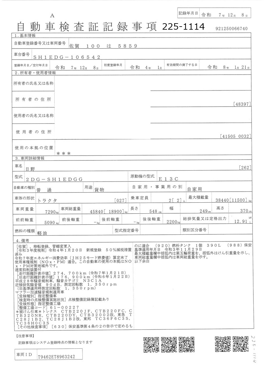 | 車両形式 | 2DG-SH1EDGG | エンジン馬力 | 450PS |