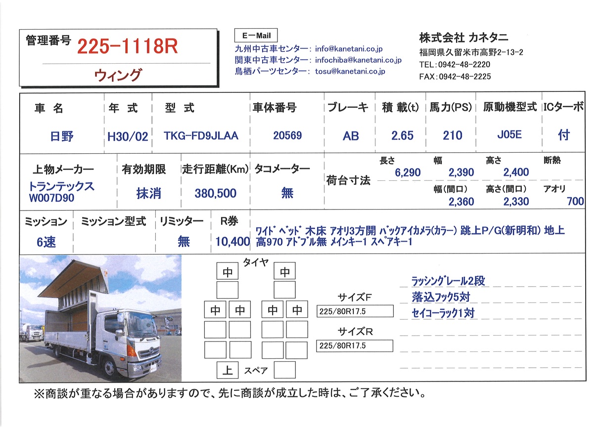 | 備考 | ワイド ベッド 木床 アオリ3方開 バックアイカメラ(カラー) 跳上P/G(新明和) 地上高970 アドブル無 メインキー1 スペアキー1 |