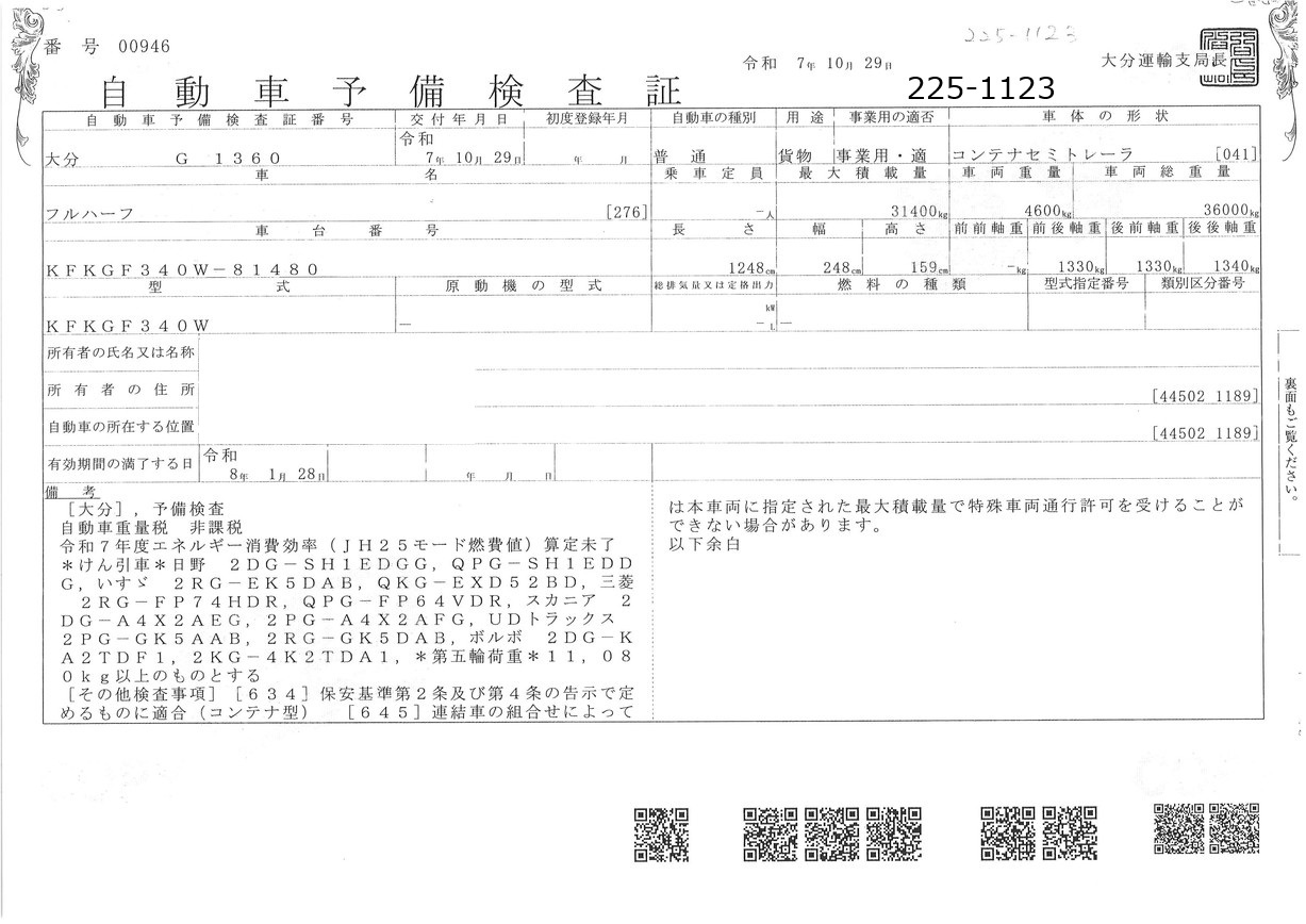 | 積載量 | 31400Kg | 長(L) | 12110mm |