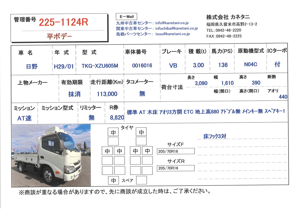 | 備考 | 標準 AT 木床 アオリ3方開 ETC 地上高880 アドブル無 メインキー無 スペアキー1 |