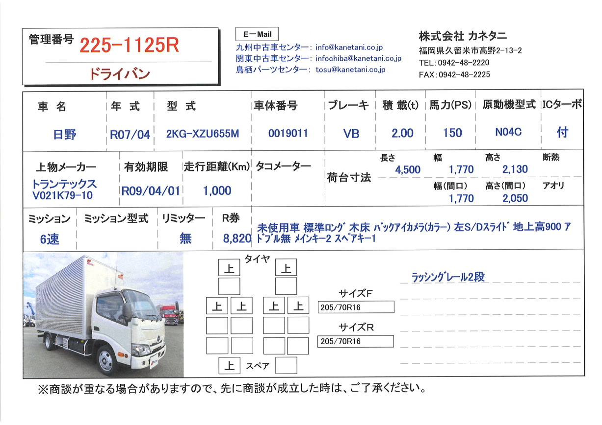 | 備考 | 未使用車 標準ロング 木床 バックアイカメラ(カラー) 左S/Dスライド 地上高900 アドブル無 メインキー2 スペアキー1 |