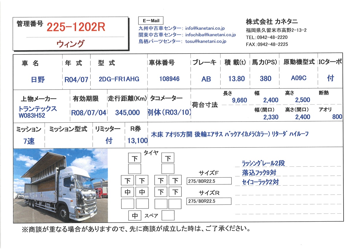 お問い合わせ番号:225-1202R| クラス(車両) | 大型 | メーカー | 日野 |