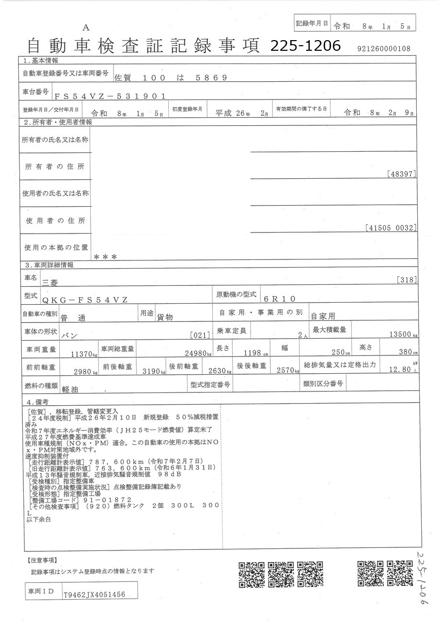 | 車検期限 | R08/02/09 | 走行距離 | 806,000Km |