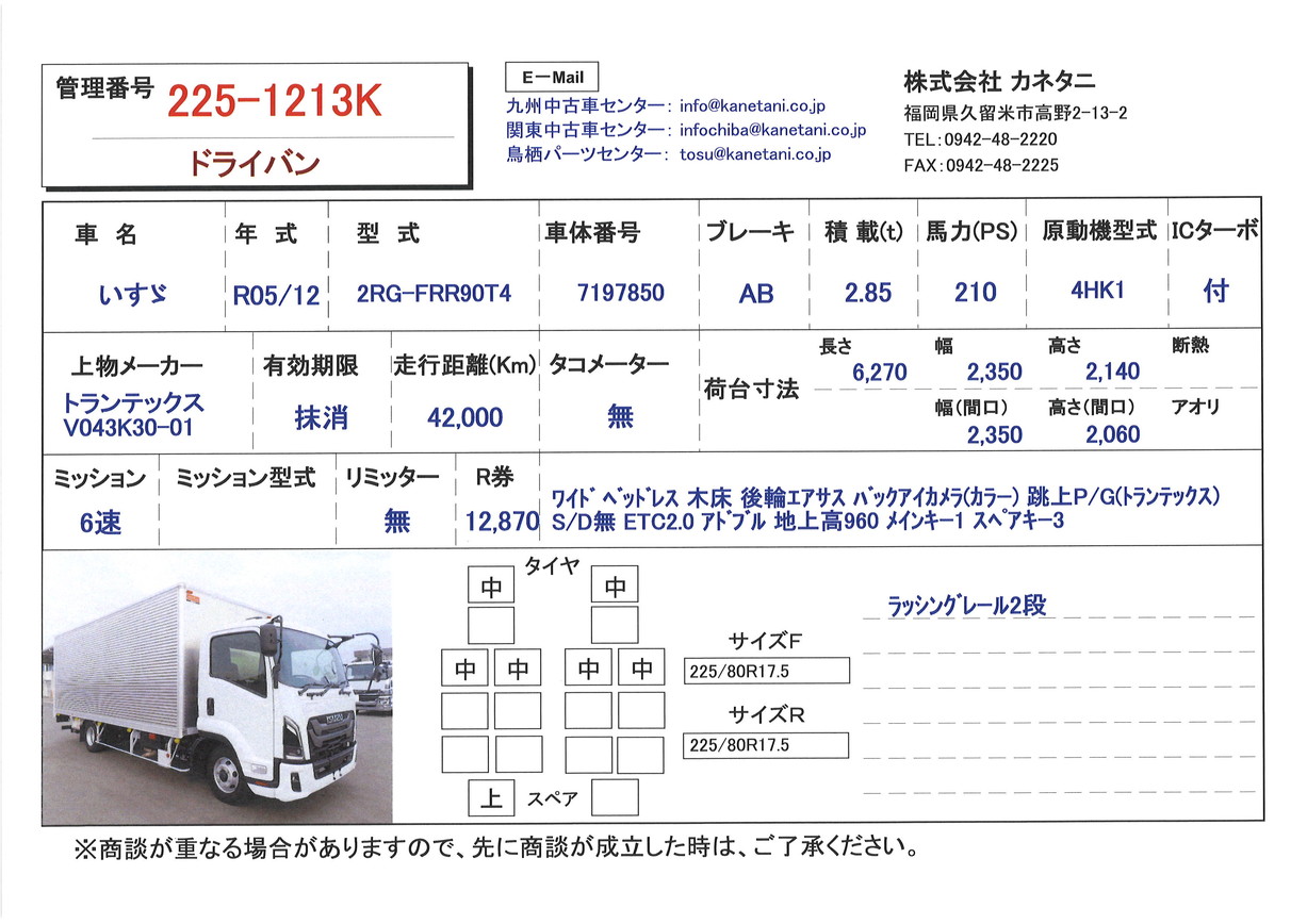 | 車両形式 | 2RG-FRR90T4 | エンジン馬力 | 210PS |