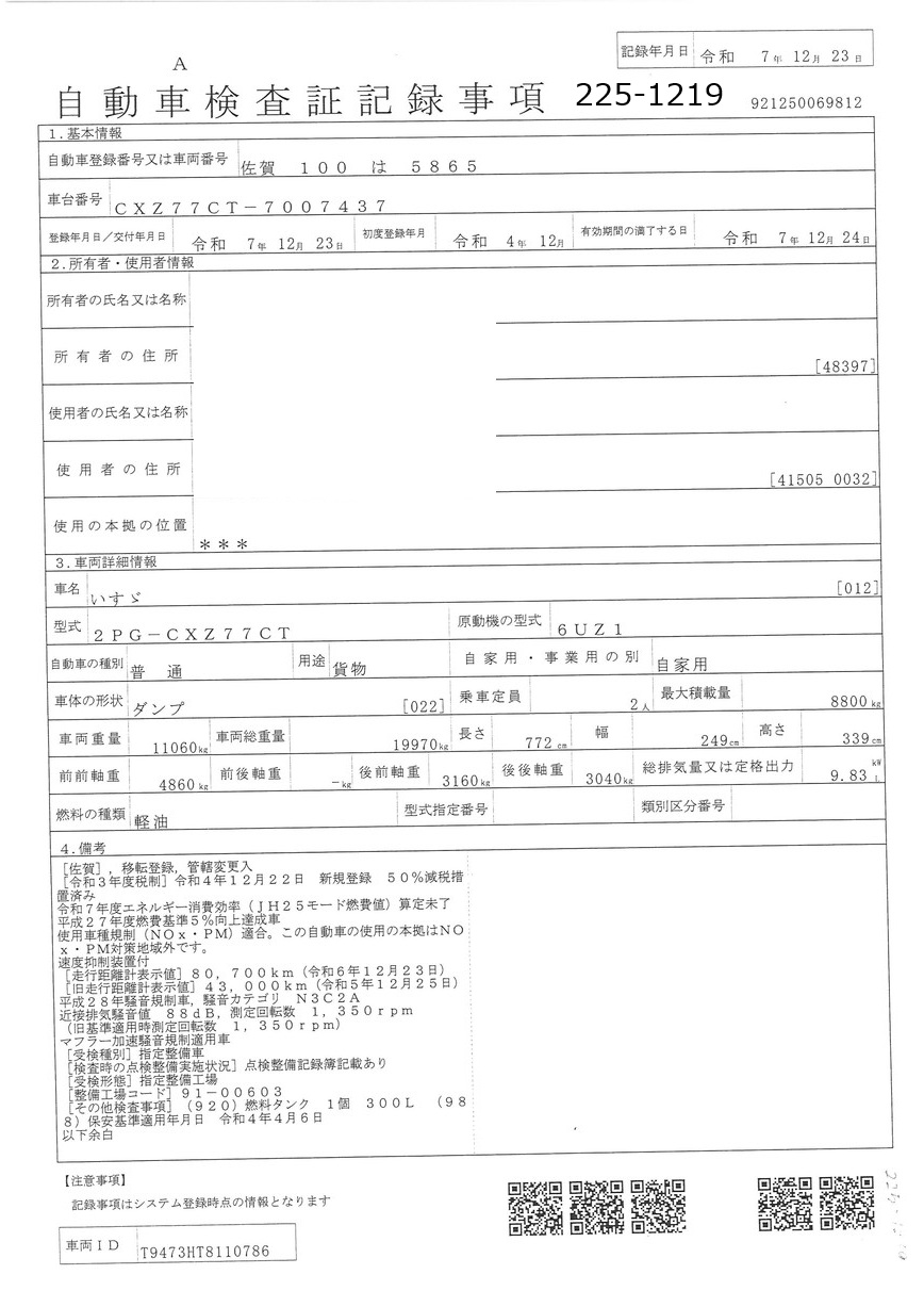 | 車両形式 | 2PG-CXZ77CT | エンジン馬力 | 0PS |