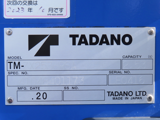 | 備考 | 3段ラジコンフックイン(吊上2.53t) 標準 鉄床 アオリ3方開 ETC アドブル 地上高840 記録簿R4-6 メインキー1 スペアキー2 スペアハンガー無 |