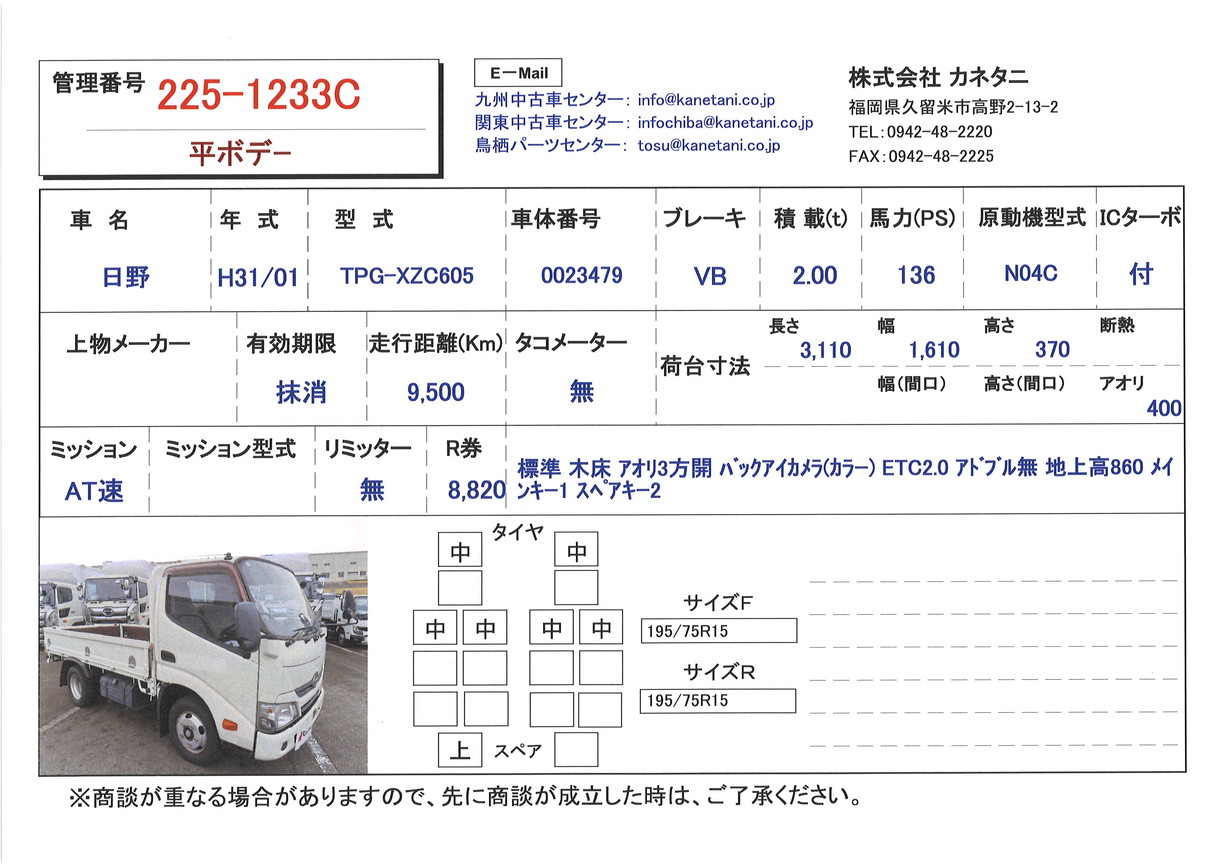 | 備考 | 標準 木床 アオリ3方開 バックアイカメラ(カラー) ETC2.0 アドブル無 地上高860 メインキー1 スペアキー2 |