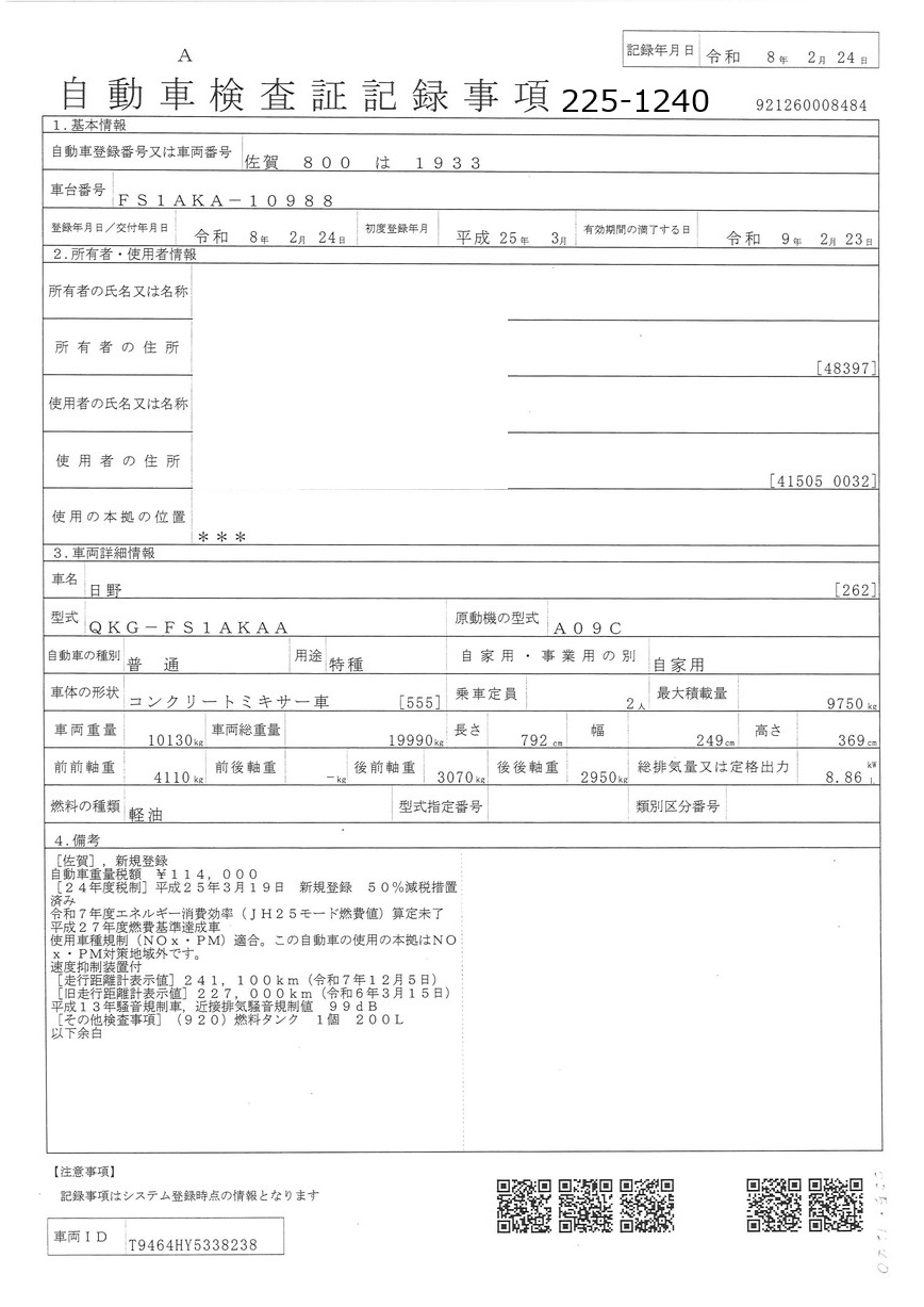 | 備考 | 最大混合容量4.4立米 手動ホッパーカバー幌 記録簿H26-R6 スペアハンガー有予備検付R8年3月4日迄 |