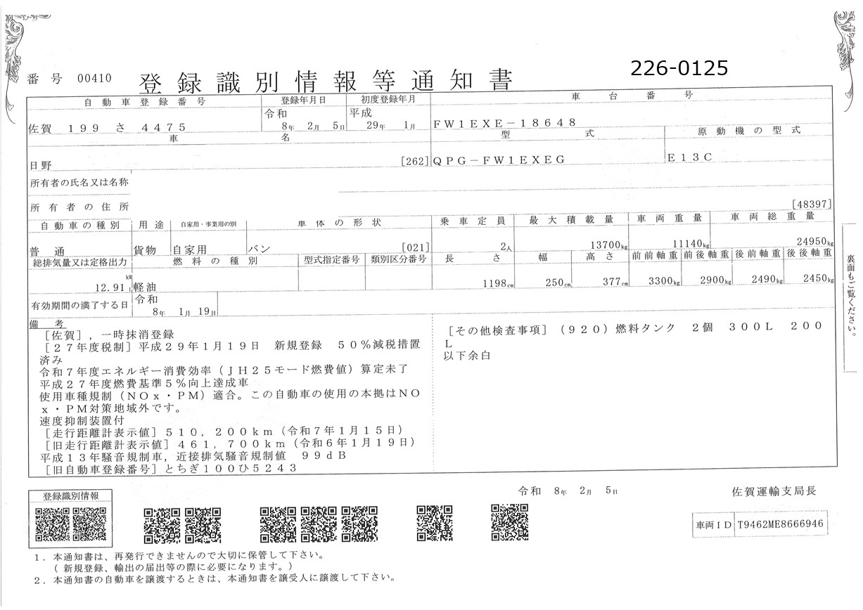 お問い合わせ番号:226-0125R| クラス(車両) | 大型 | メーカー | 日野 |