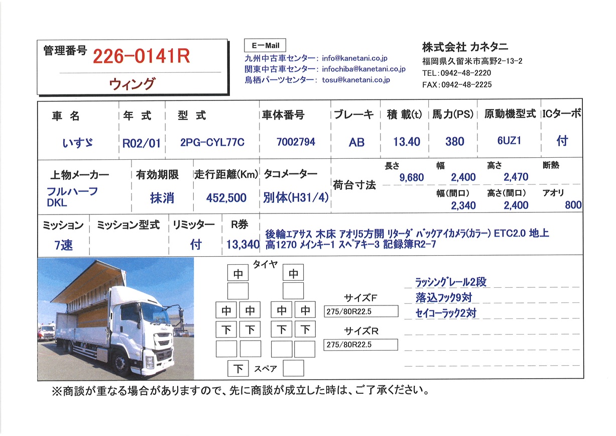 | 備考 | 後輪エアサス 木床 アオリ5方開 リターダ バックアイカメラ(カラー) ETC2.0 地上高1270 メインキー1 スペアキー3 記録簿R2-7 |