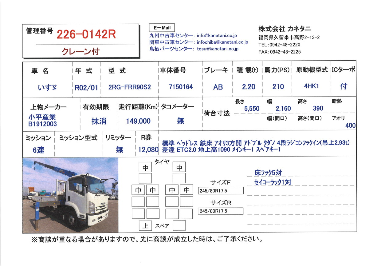 | 車両形式 | 2RG-FRR90S2 | エンジン馬力 | 210PS |