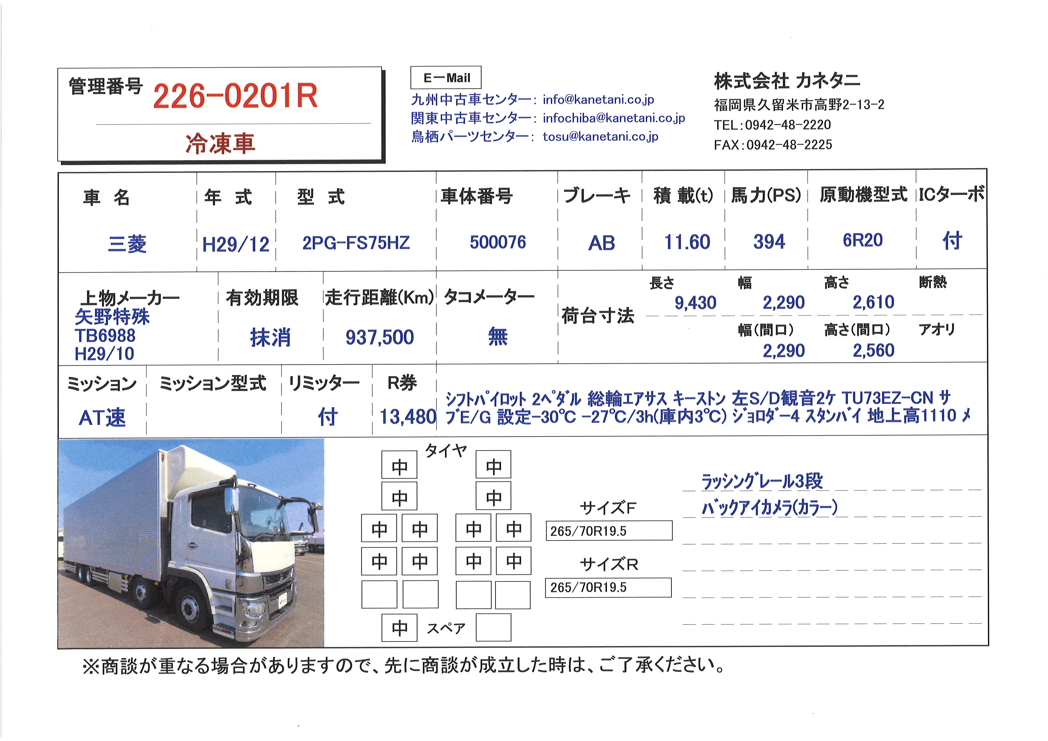 | 備考 | シフトパイロット 2ペダル 総輪エアサス キーストン 左S/D観音2ケ TU73EZ-CN サブE/G 設定-30℃ -27℃/3h(庫内3℃) ジョロダー4 スタンバイ 地上高1110 メインキー2 |