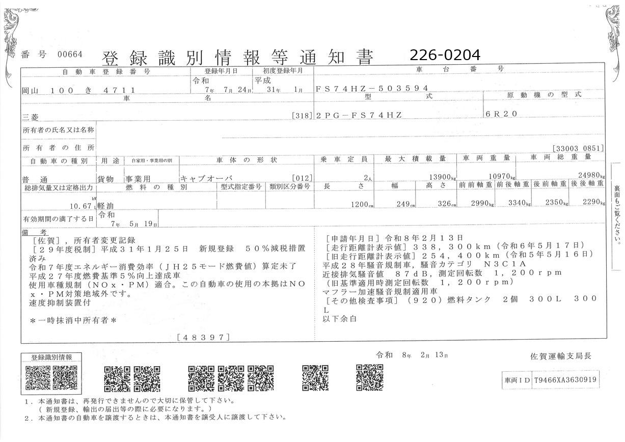お問い合わせ番号:226-0204R| クラス(車両) | 大型 | メーカー | 三菱 |