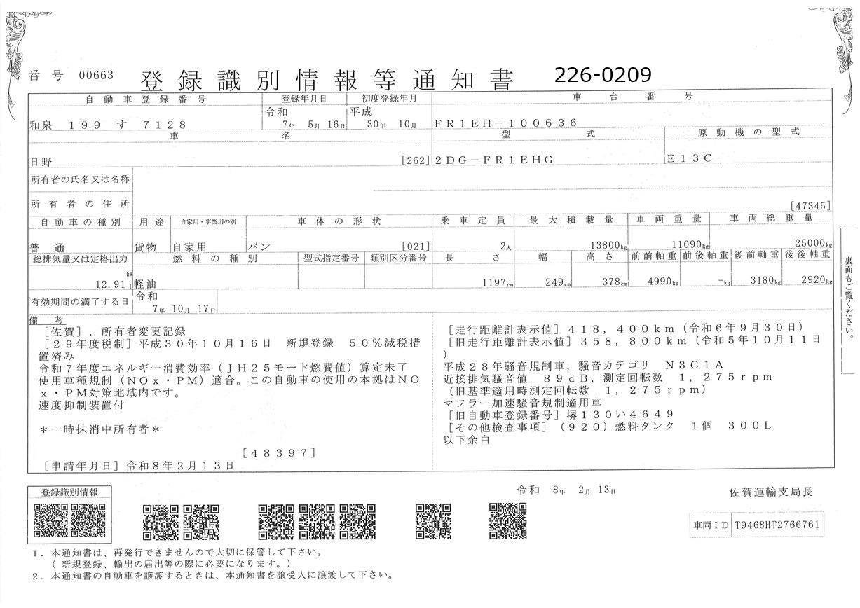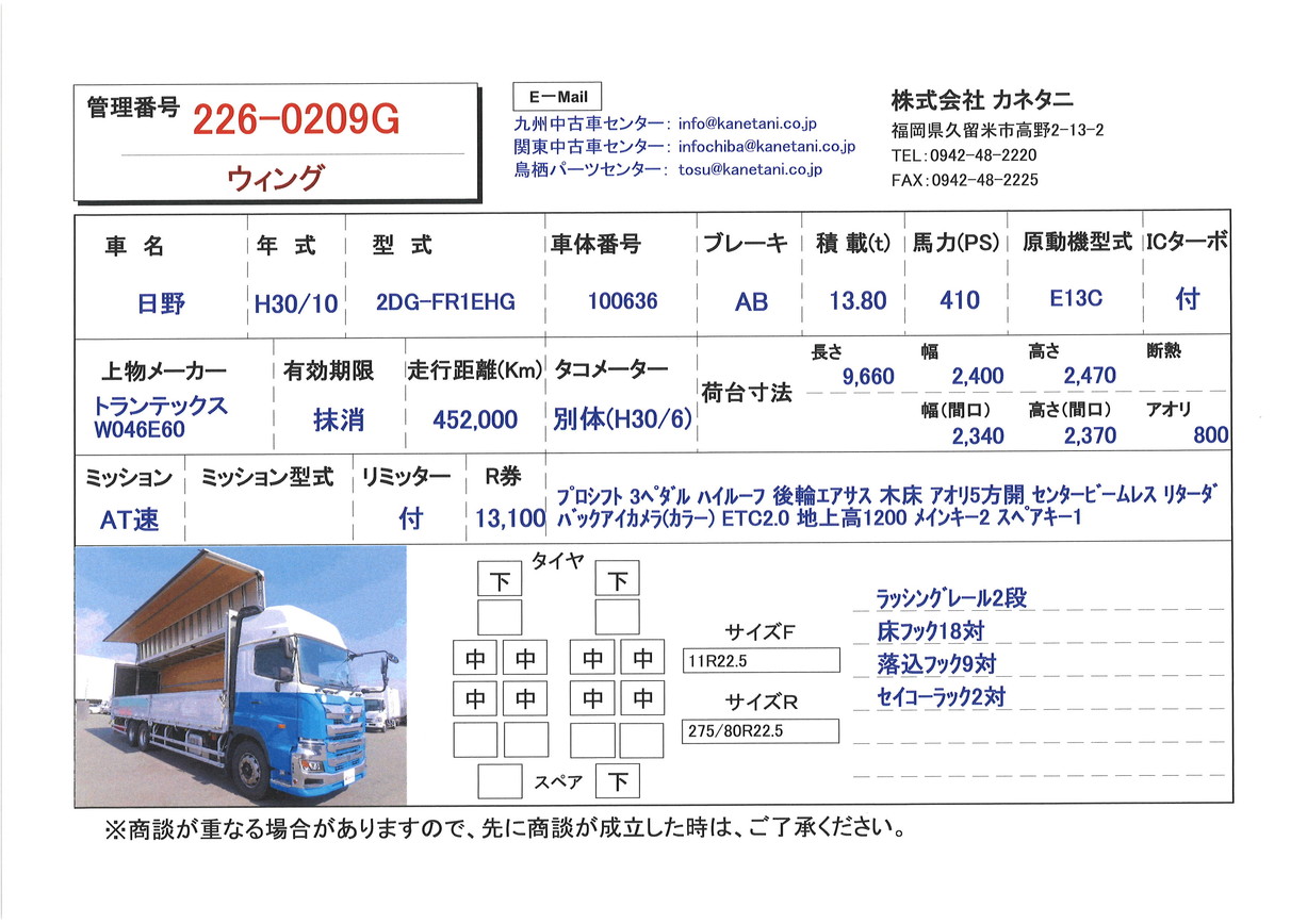お問い合わせ番号:226-0209G| クラス(車両) | 大型 | メーカー | 日野 |