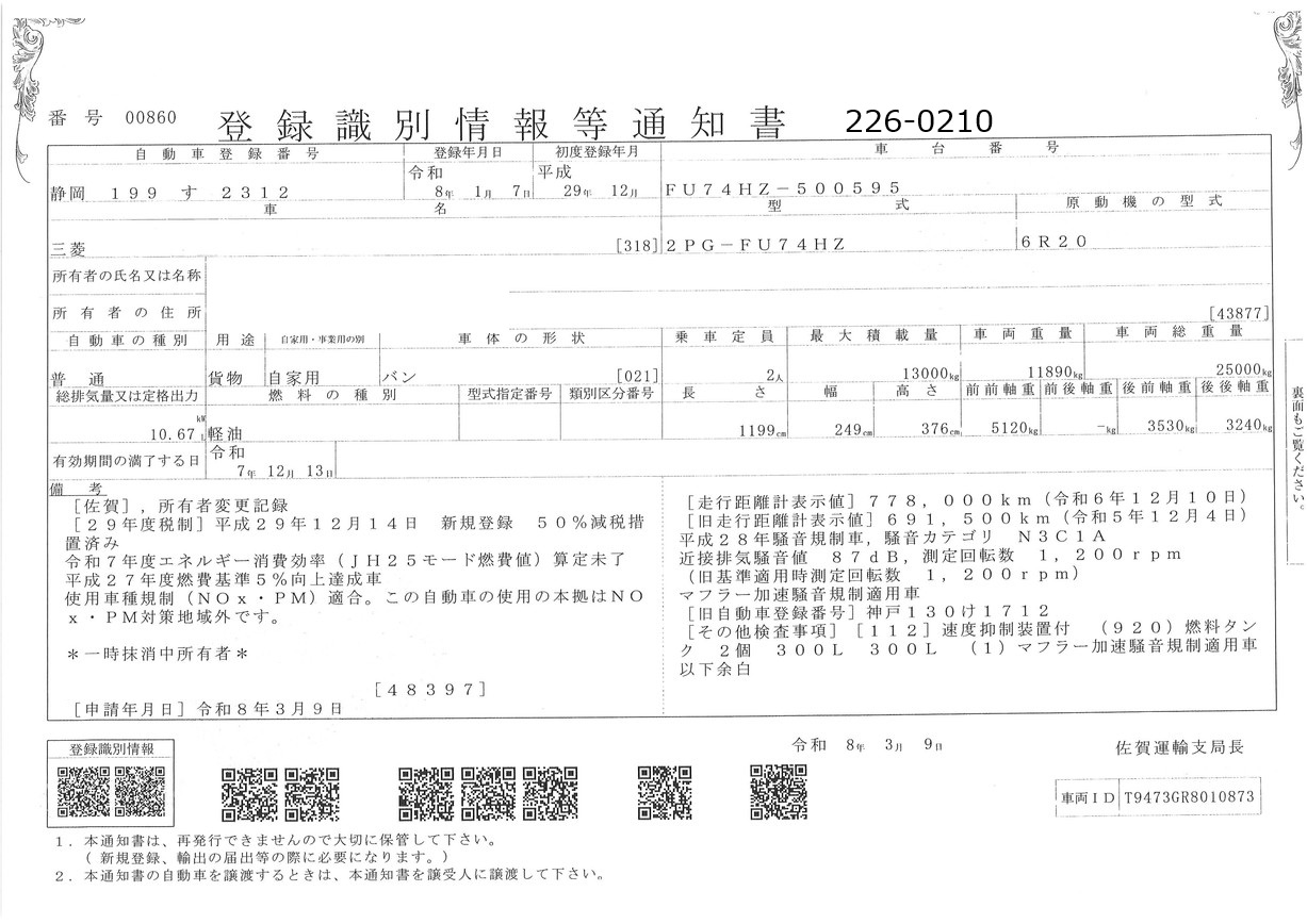 お問い合わせ番号:226-0210G| クラス(車両) | 大型 | メーカー | 三菱 |