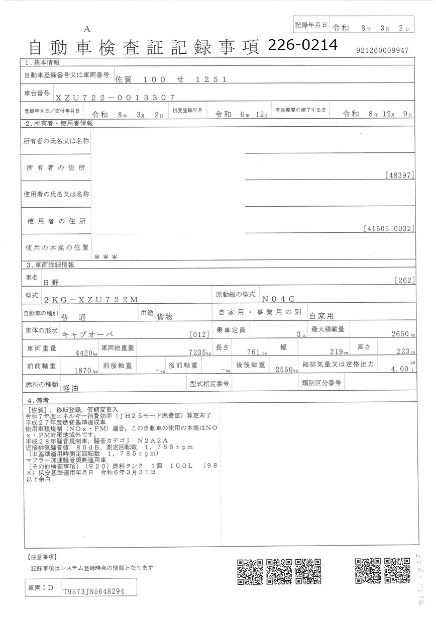 | 車両形式 | 2KG-XZU722M | エンジン馬力 | 150PS |