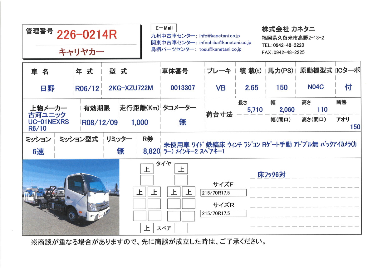 | 備考 | 未使用車 ワイド 鉄縞床 ウィンチ ラジコン Rゲート手動 アドブル無 バックアイカメラ(カラー) メインキー2 スペアキー1 |
