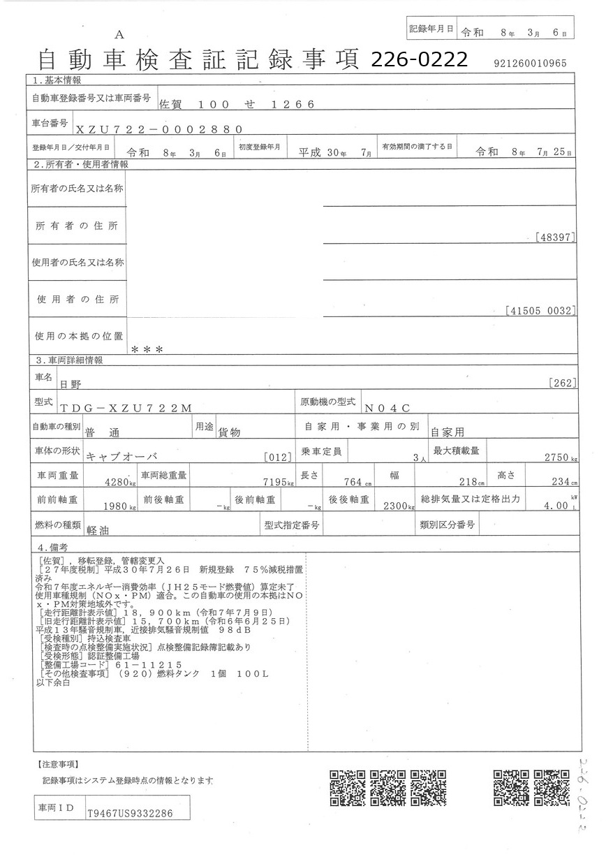 お問い合わせ番号:226-0222R| クラス(車両) | 小型 | メーカー | 日野 |