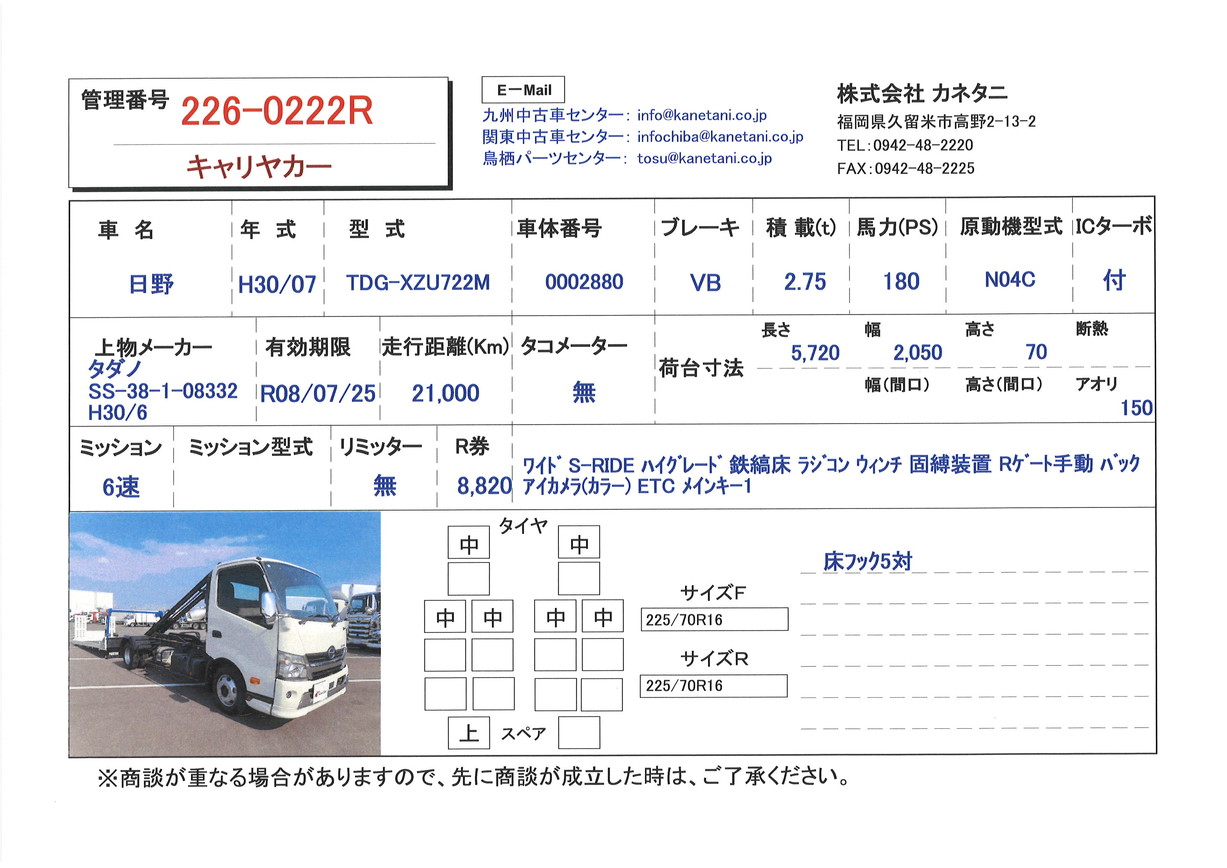 | 備考 | ワイド S-RIDE ハイグレード 鉄縞床 ラジコン ウィンチ 固縛装置 Rゲート手動 バックアイカメラ(カラー) ETC メインキー1 |