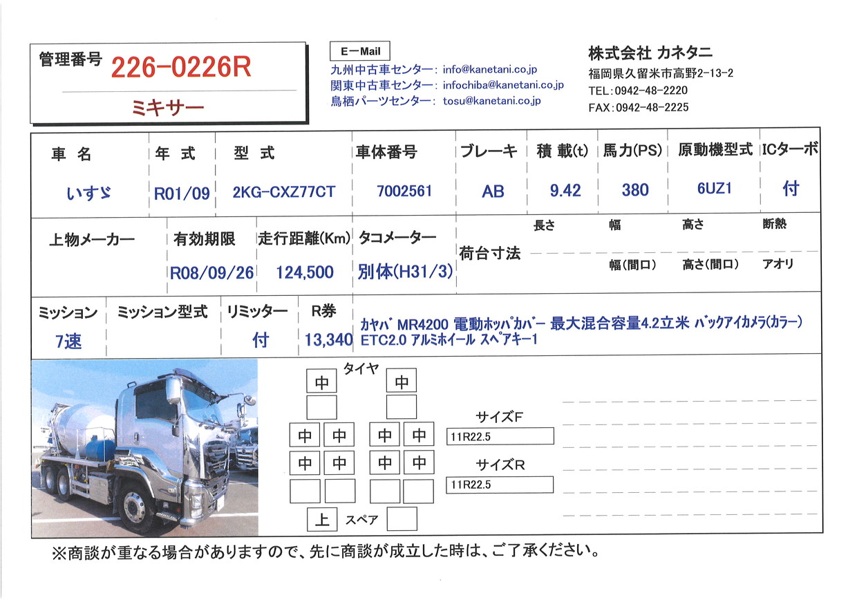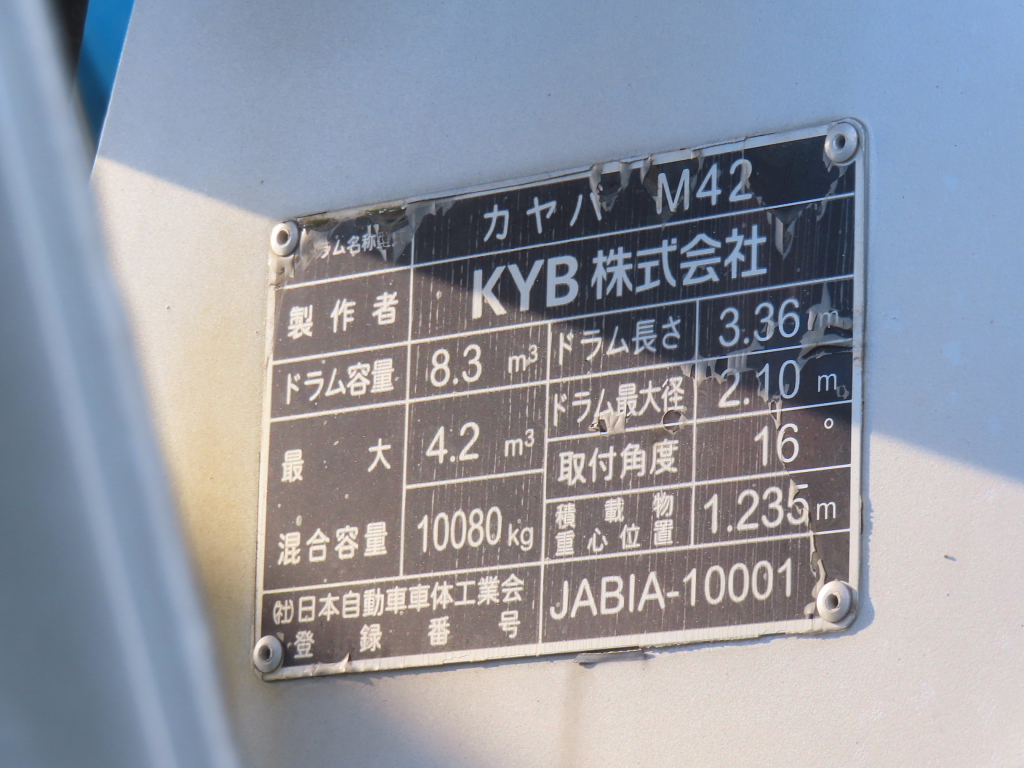 | 備考 | カヤバ MR4200 電動ホッパカバー 最大混合容量4.2立米 バックアイカメラ(カラー) ETC2.0 アルミホイール スペアキー1 |
